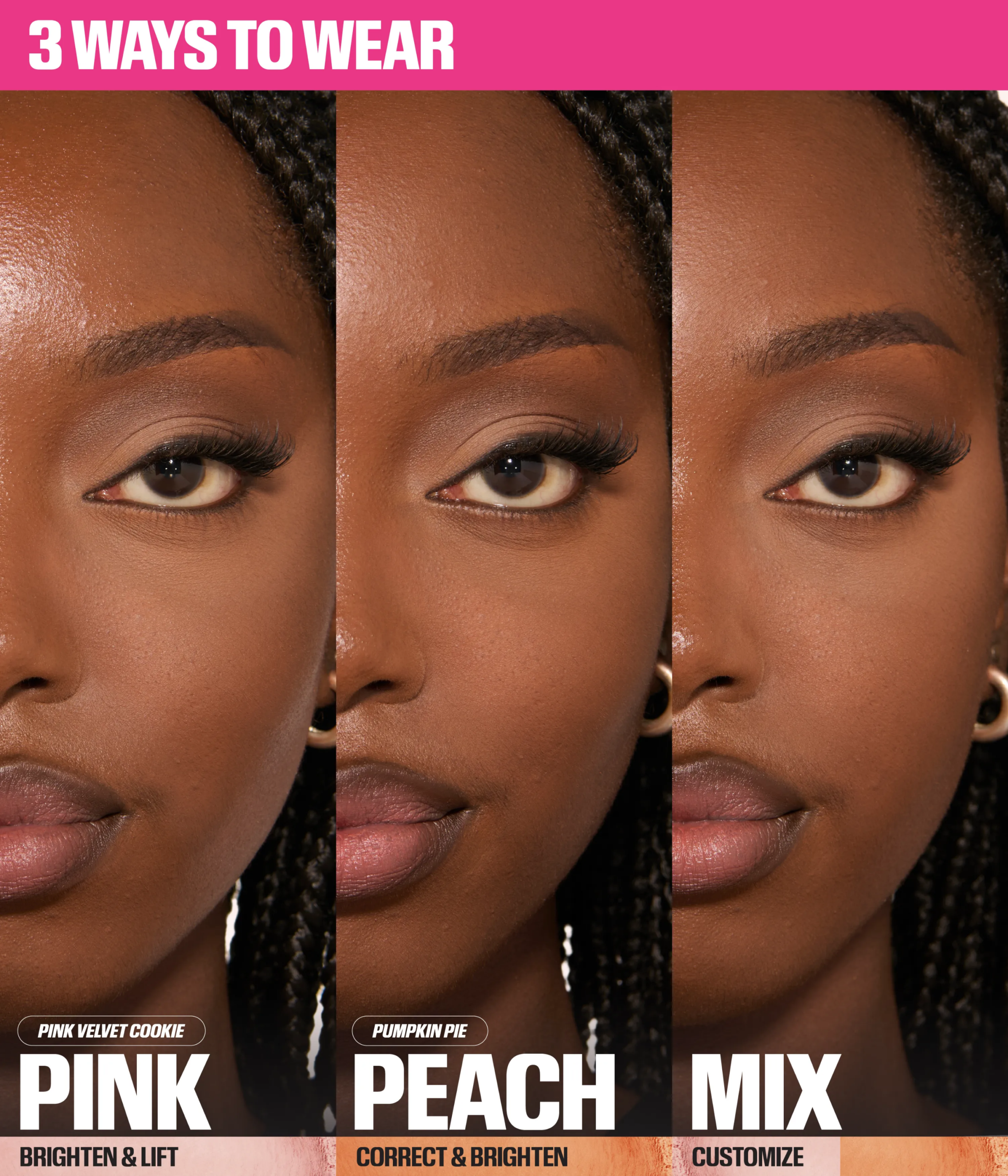The innovative pack design allows for easy shade selection; use pink to brighten & lift, peach to correct & neutralize dark circles or remove selector to mix powders and customize shade intensity for the ultimate bright & snatch undereye.